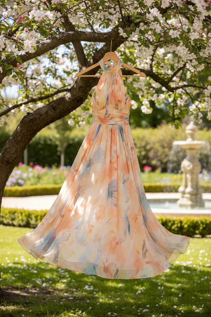 Step into a dress that moves with you, designed to celebrate your feminine grace with every step. This flowing halter neck dress combines subtle sophistication with a soft pastel watercolor print, making you the centre of attention at any summer event or special occasion.